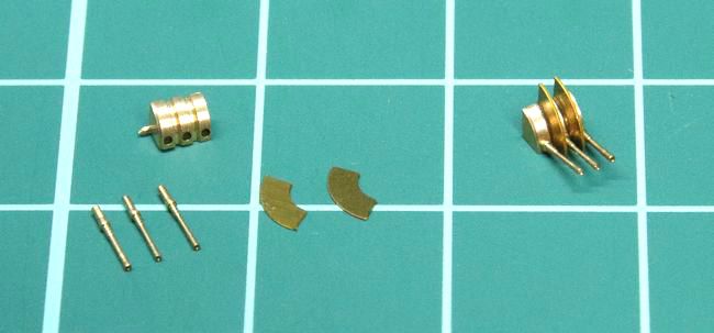これは、銃身基部の真鍮削り出しパーツと、挽物の銃身本体、そして仕切りのエッチングです。組み立て順は、先に銃身を削り出しパーツに差し込み、後からエッチングを取り付ける方が能率的に進みます。