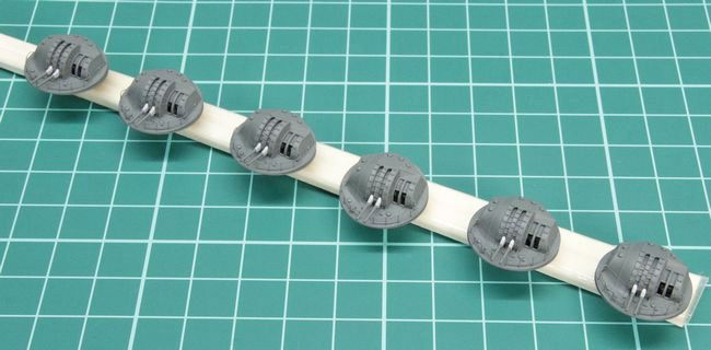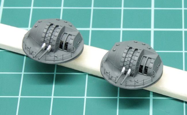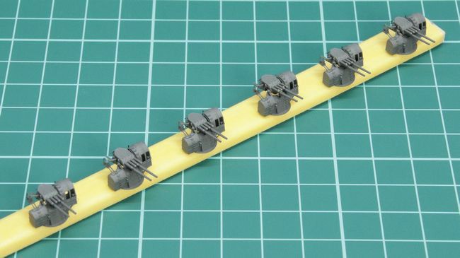6基のシールド付き12.7cm連装高角砲。塗装順は、黒サフのあと、まず下面色を全体に吹き、側面から基本色(側面色)、真上から平面色と言う順で仕上げました。