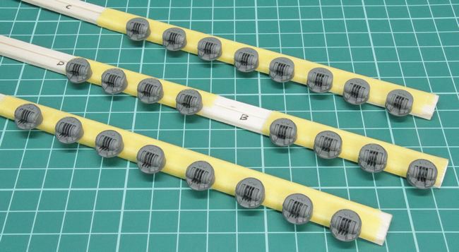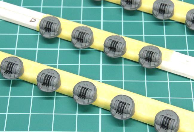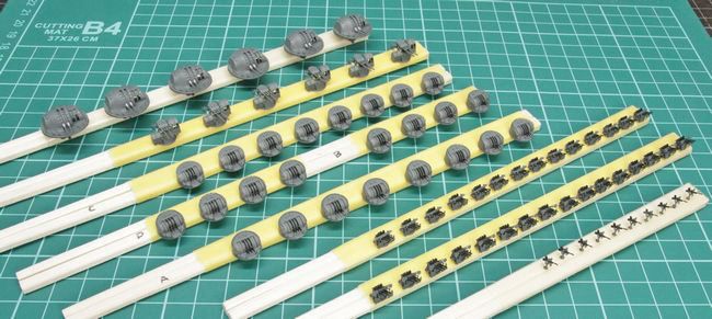 25基の機銃には、計4種類のシールド形状がありますので、割り箸に貼って分類しておきました。(銃身はエナメル塗料の筆塗りとしました)