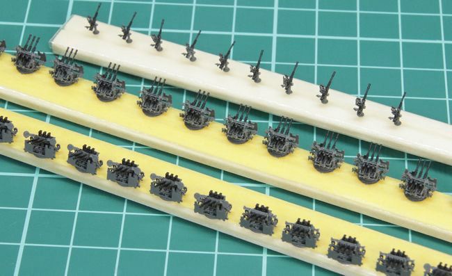 ここまでに製作したした対空兵装を全て並べた様子。フル3Dプリントのパーツもあれば、3D+エッチング、プラパーツ+真鍮パーツ+エッチングという具合に、バラエティ豊富なラインナップです。