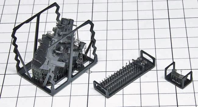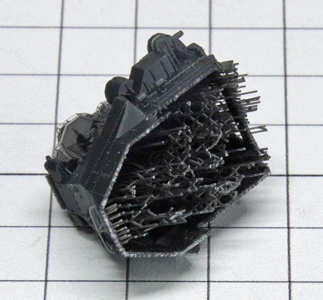 1/350のアオシマキット製作、真鍮線で自作した前面の砲身用のフレームも一体でプリントされています。ただ、下面のサポートは非常に本数が多く、3Dプリント用ニッパーだけでは切り出しが困難でしたので――、
