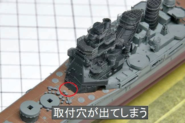 フライホークのエッチング甲板との兼ね合いで、キットの艦橋取り付け穴が出てしまう問題が発生。リノリウム甲板がキットのままなら、プラ丸棒などで埋めればいいだけなのですが、エッチング甲板側の取り付けガイドの形状が合わないので、艦橋そのものを僅かに前進させてカバーしました。(その分、後部に合わせ目が出来てしまいますが、そこはプラ板で塞ぎました。)