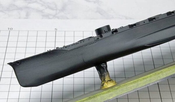 最後は0.1号のメタルリギングで空中線を追加し、デカールを貼ってUVカット艶消しクリアーで処理して終了です。マストトップの琴型アンテナは、マストパーツの強度不足のために見送りましたが、その他の部分はエッチングによるディテールアップのレベルに合わせたバランスで仕上げています。(写真は作業中の様子)