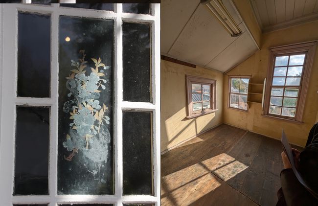 内部も、案内付きで見学させていただきました。写真左側には、海軍で使用されていた当時から描かれていた「桜に錨」のモチーフ。ガラスも多くが戦前のものがのこされており、木製サッシな内部も調度品など、貴重な品が現在も使用されていました。