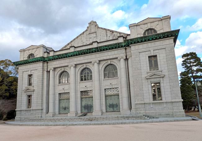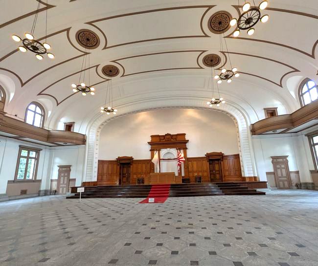 大講堂の内部は荘厳と言う他はありません。内部はドーム型天井、舵輪を模したシャンデリアが備えられ、部隊には天皇陛下がお座りになる玉座があります。こうした施設が我々一般人にも開放されていることには、本当に驚かされます。