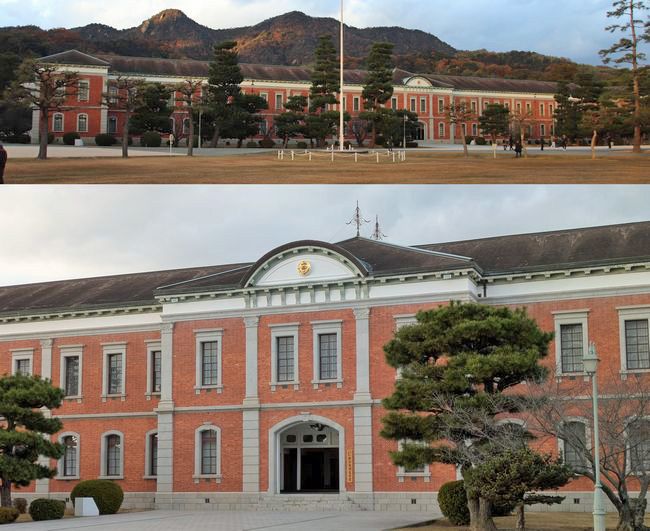 続いては、幹部候補生学校の本館(旧海軍兵学校)をご案内いただきました。建物の大きさは、当時の艦船のサイズとほぼ同じ144mとされており、レンガ造りで左右対称の美しい建築美を魅せてくれます。この建築に使われた煉瓦は、かつては英国から輸入されたものが使用されたと伝えられていましたが、現在の研究では国産のレンガにほぼ町がないという結論が出ているそうです。