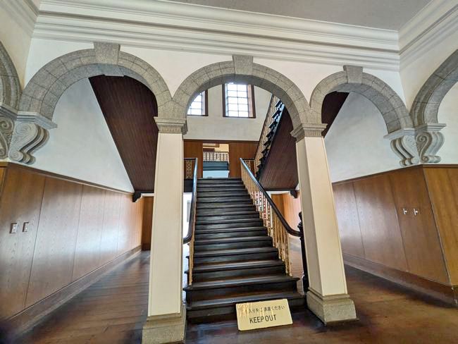 内部の様子。出入り口に扉はなく、常に明け放されているのが特徴です。これはエントランスを入ったところにある、重厚な木製の二股階段の写真で、正面入り口上部のガラスが強風で割れる事故があり、1枚だけ近年の板ガラスに換えられていることなど、貴重な裏話を教えていただきました。