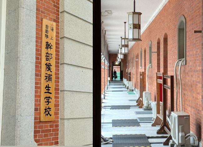 幹部候補生学校の看板と、廊下の様子。近年、あまりにも暑い夏が続いていることから、ついにエアコンの室外機が取り付けられました。海上自衛隊としても苦渋の決断だったそうで、来年以降、夏の気候が安定したら取り外される可能性もあるとのこと。となると、この光景は、ある意味レアカットになるのかもしれません。
