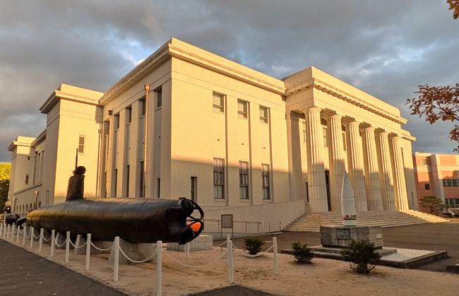 最後にご案内いただいたのは、貴重な資料が山のように展示された「教育参考館」。内部は撮影禁止ですが、当時やりとりされた手紙や遺品、軍装品、海軍にまつわる美術品や、実物の艦船装備品など、盛りだくさんの展示を間近に見ることができました。また、館外には特殊潜航艇や魚雷、砲弾、単装砲などの実物資料も数多く展示されており、見学者は手に触れるほどの距離で実物の息吹に触れることができます。