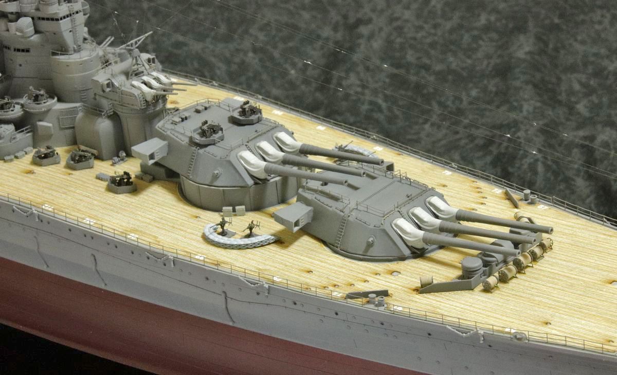 別アングル。デッキ上には隔壁番号が再現され、舷側の外板継ぎ目と舷窓蓋には、メリハリの強いモールドが施されています。第二主砲塔上部の機銃座は八角形状となっているのが、ベリーファイアキットの特徴です。