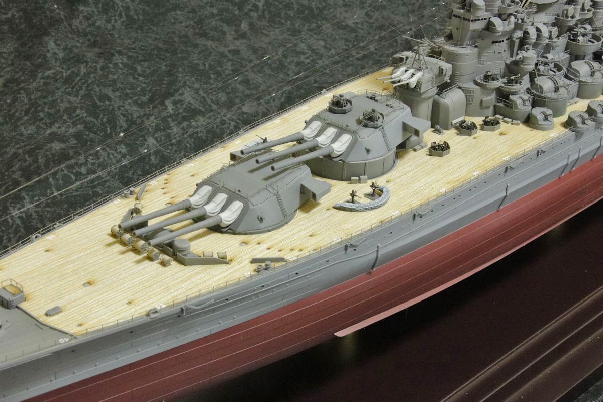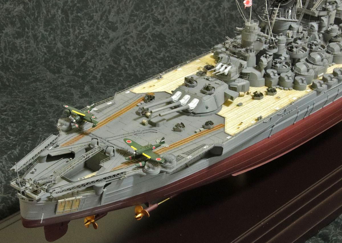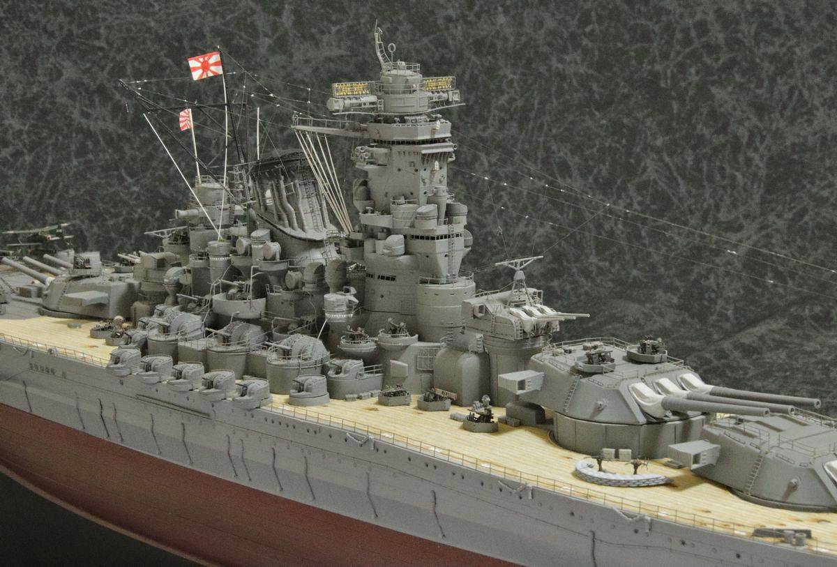 1/350戦艦「大和」ディテールアップ完成品、左舷艦首側からの全景。製作者は、モデルファクトリーハイギヤード所属モデラーのOh!磯氏です。