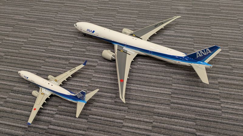 「737-300」はストレートに製作し、「777-300ER」は窓を埋めるなどの、多少の加工をおこないました。ANAカラーは737が調色、777がガンダムカラーの流用ですが、並べても違和感がない程度に仕上がりが揃ってくれたと思います。