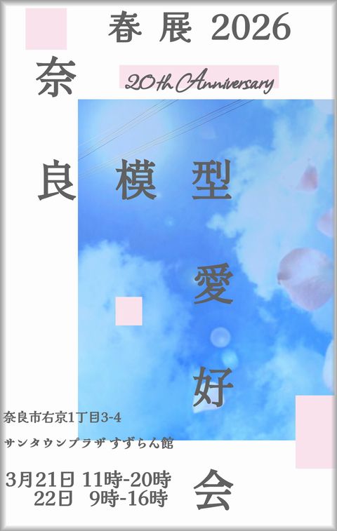 毎年「奈良模型愛好会 春展」の開催が決定しました。場所は、いつもとおなじ奈良市のショッピングモール「サンタウンプラザ すずらん館」で、開催日時は例年昨年より少し早めの3月21日から22日の予定です。