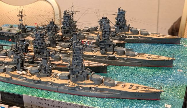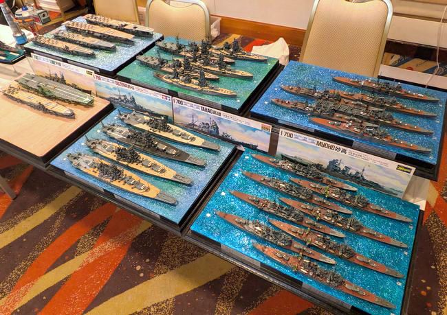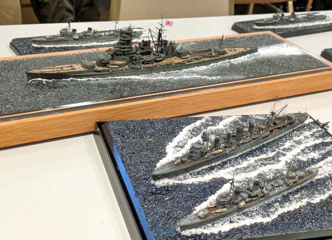 今回は、モデラー同士の交流も非常に盛んでした。こちらは、SNSでも良くご交流をいただき、奈良模型愛好会の展示会にも足を運んでくださる、けんさんの作品群。今回は三水戦の軽巡&駆逐艦を並べておられたので、(偶然持参していた)私の1/700戦艦「霧島」を加えて、第三次ソロモン海戦の編成を表現してみました。