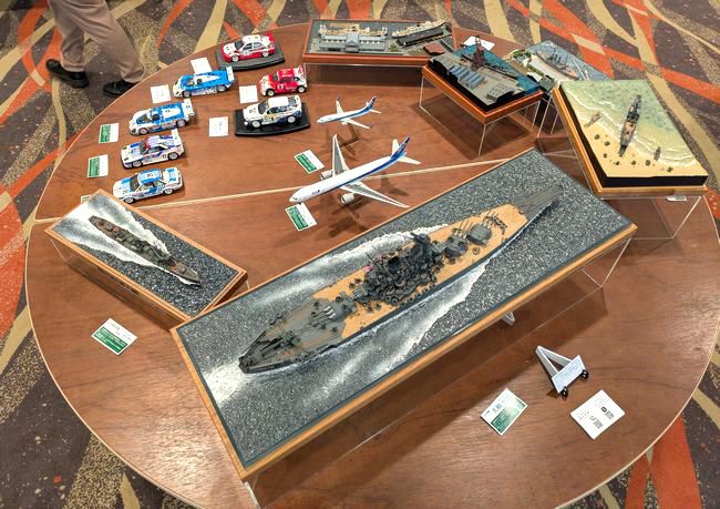 最後に私の展示宅ですが、直径180cmの円卓をご用意いただきましたので、1/350戦艦「大和」や港湾ジオラマをメインに、カーモデル、旅客機などを配置して彩りを添えました。