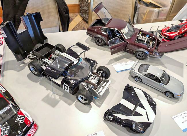 こちらは、私と同じく奈良で活躍されている作例ライターのDAY-DATEさんの作品群。自動車整備をされていた経験から、非常に説得力のあるカーモデルのメカニズム表現がなされています。1/12のような大型カーモデルも多く製作されており、この写真のローラT70も、キットの古さを感じさせない精悍な作品に仕上げられていました。