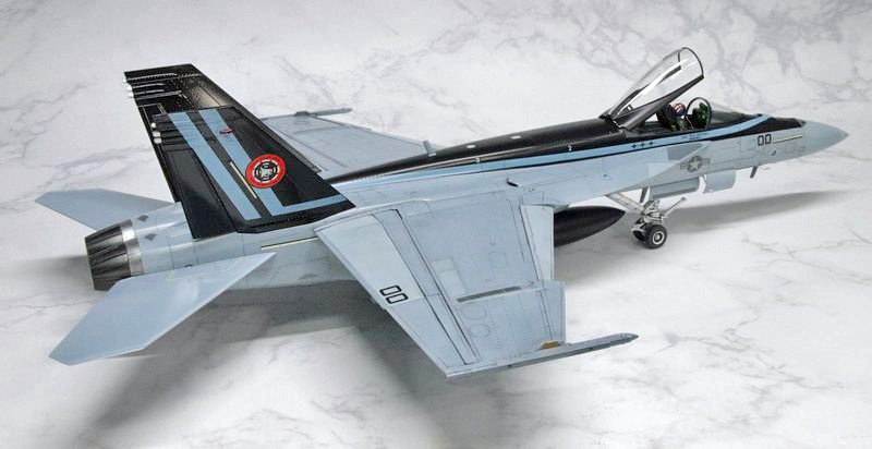 1/48アメリカ海軍「F/A-18E スーパーホーネット」完成品、右後方からのローアングルでの全景。
