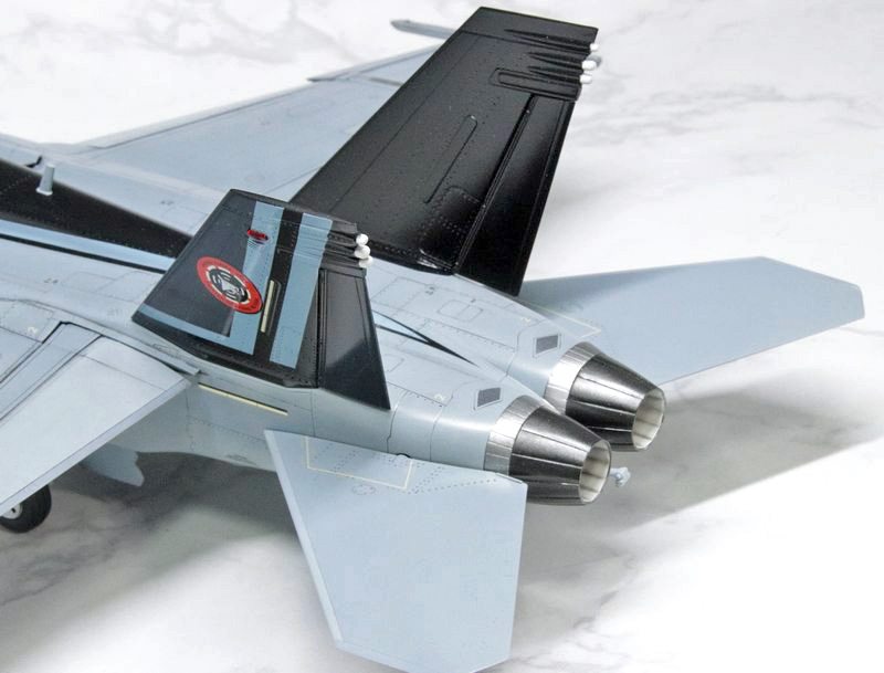 エンジンノズルと垂直尾翼のクローズアップ。F/A18特有の絞られた機体後部と、やや前方に配置された垂直尾翼が独特の造形美をみせてくれます。