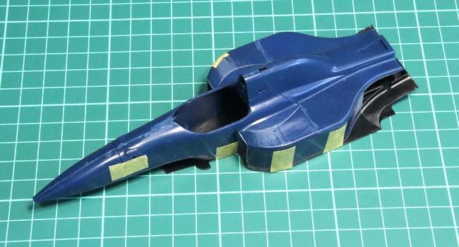 接着が終わり、アンダーパネルから外したカウリングの様子。リアカウルの分割は少々複雑ですが「フィッティングを調整しやすい」という点では、案外、悪くない設計と言う気がります。(サイドポンツーン前端部を、少し内側に絞り込むような角度で接着してから、モノコック&アンダーパネルに合わせると上手く行きます)