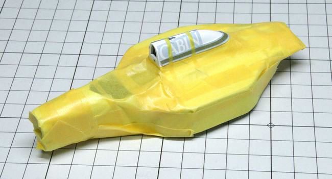 ラインのデカールのコピーを切り抜き、カウリングに重ねました。このような要領で、キャビンカラーの塗り分け位置を決めていきます。