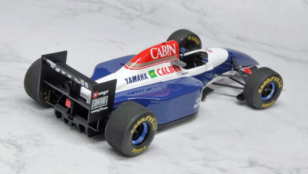 1/24「ティレル021 ヤマハ」、右サイドからのリアビュー。実車はティレル019からの流れをくむドルフィンノーズ&コルセアウイングのスタイリングの最終モデルで、設計はマイク・コフラン。1993年全戦を通して、最高位10位の結果を残しました。