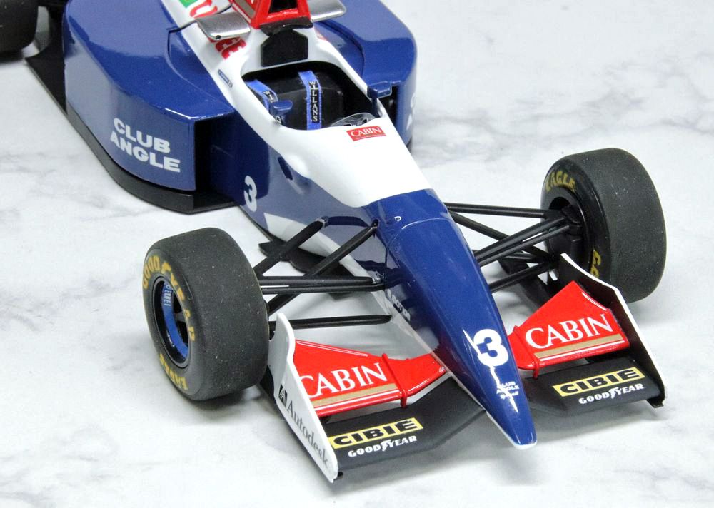 フロント周りのクローズアップ。右京選手のマシンの特徴でもある、大型のヘッドレストと車載カメラはホワイトメタルパーツが用意され、日本グランプリ当時の仕様を実感たっぷりに再現してくれます。