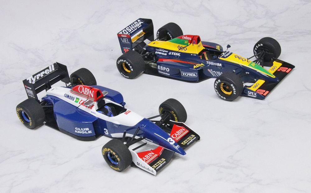 1990年型の「エスポラルース ローラLC90 ランボルギーニ」とのツーショット。どちらも1/24スケールのハセガワキットですが、ラルースと比較して、ティレルのキットは後年開発とあって、全体的に「同一設計の正常進化版」という印象を持ちました。1/24のフォーミュラカーのキットとしては、かなりの「当たり」です。