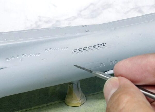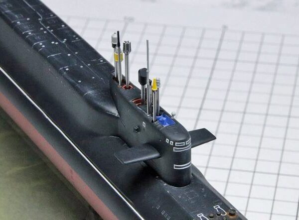 位置合わせを終えたエレベーターは、いったん取り外して個別に塗装したのち、再接着しました。続いては、舷側への細かなパーツ取り付けに進みます。