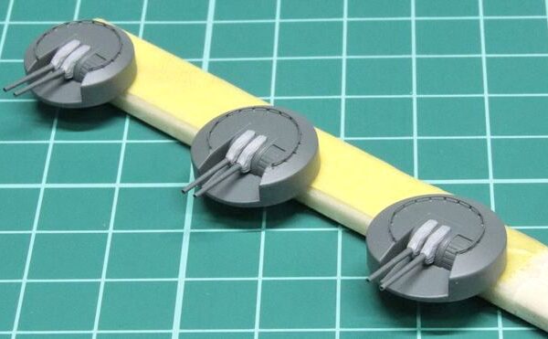 艦橋基本部の塗り分けが完了したら、次は通路や足場、スポンソンなどのエッチングを取り付けます。これらは先に接着してしまうとマスキングが面倒になるため、取り付け前に水平面&垂直面の塗り分けを済ませておきました。