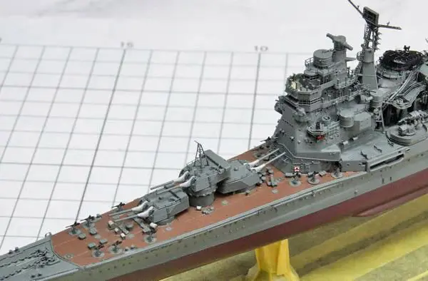 写真左は前部マストで、右側は後部マスト。これらも水平部と垂直部の塗り分けが必要になるため、艦橋と同じ順序で塗り重ねました。